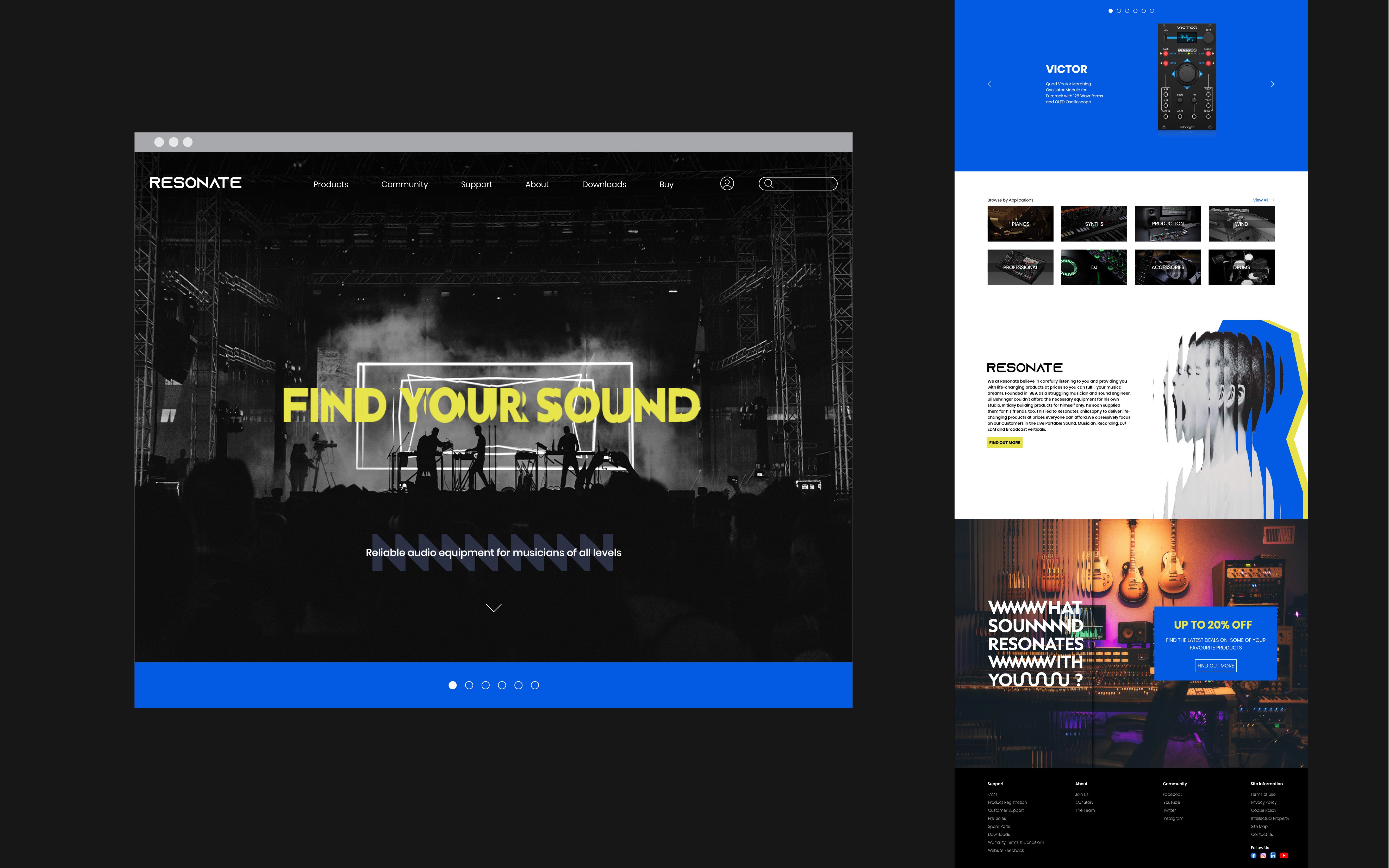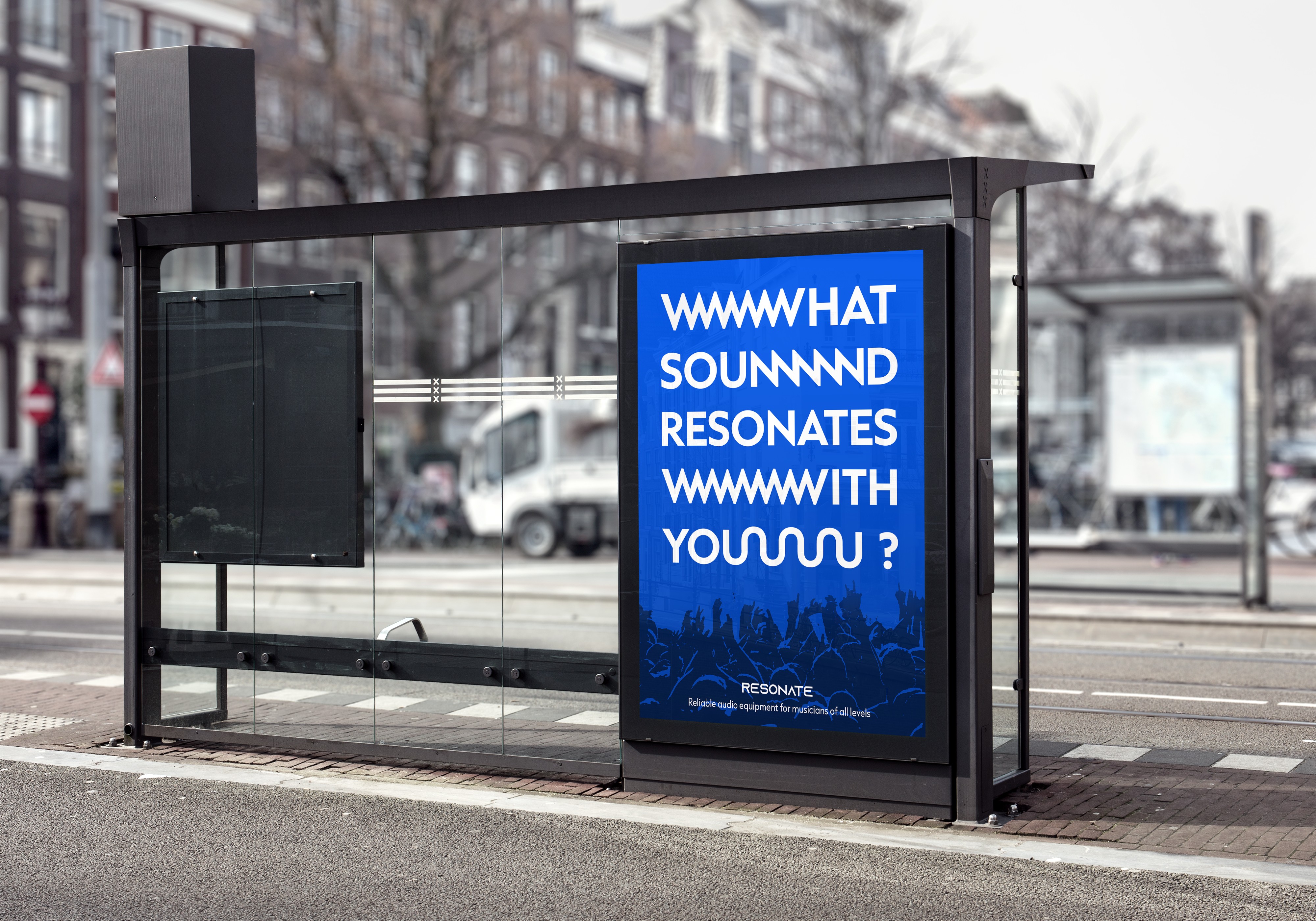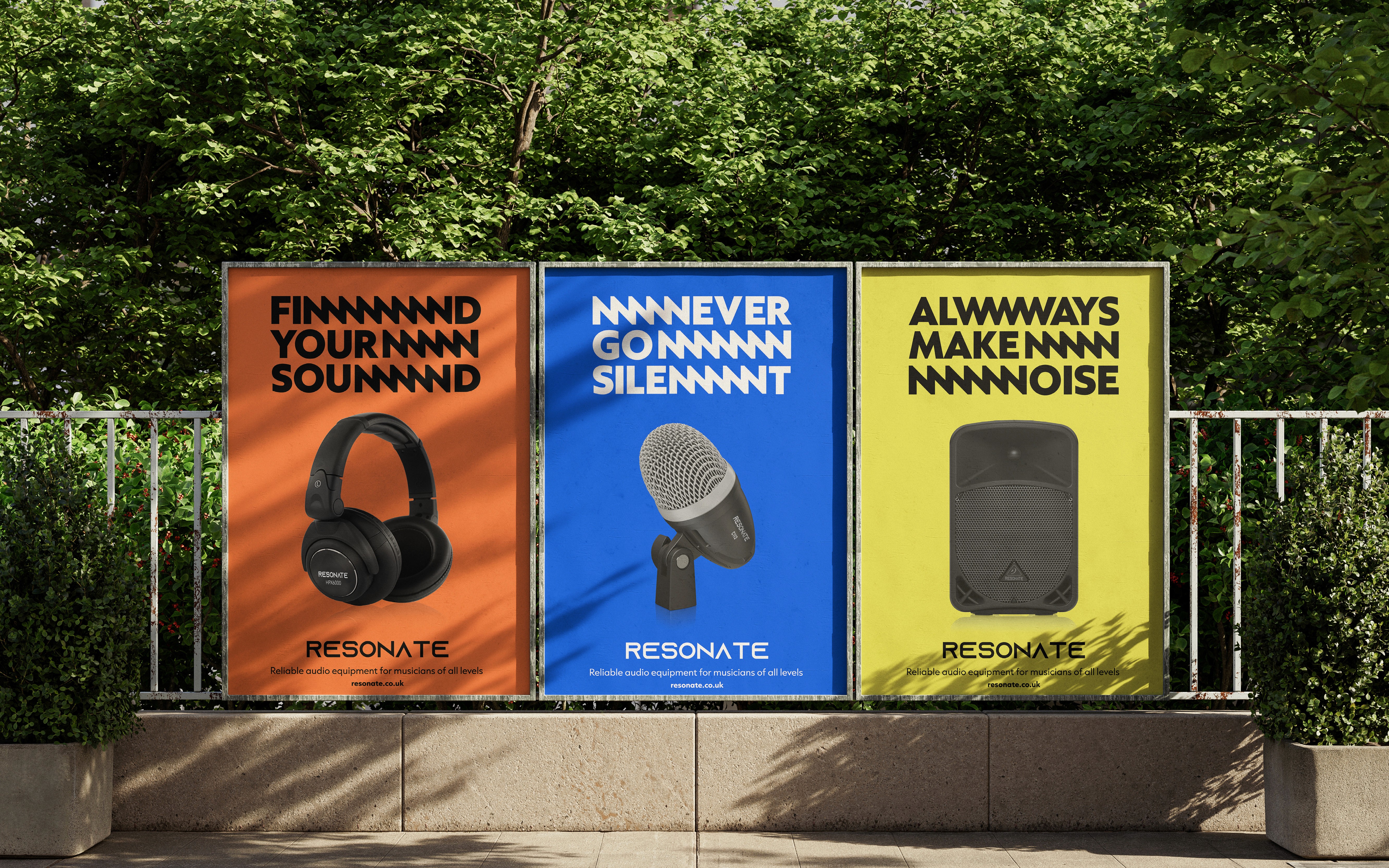 Resonate is a conceptual rebrand of the music equipment company, Behringer. A brand identity based around sound waves, this rebrand uses a typographic system alongside image treatment to provide a sense of movement and intrigue. The use of thick sound waves built into a bold and accessible sans serif type represents the brand’s focus on providing strong and reliable music equipment to a wide audience. The loud colours carry with them the brand’s message of finding one’s sound and making noise.